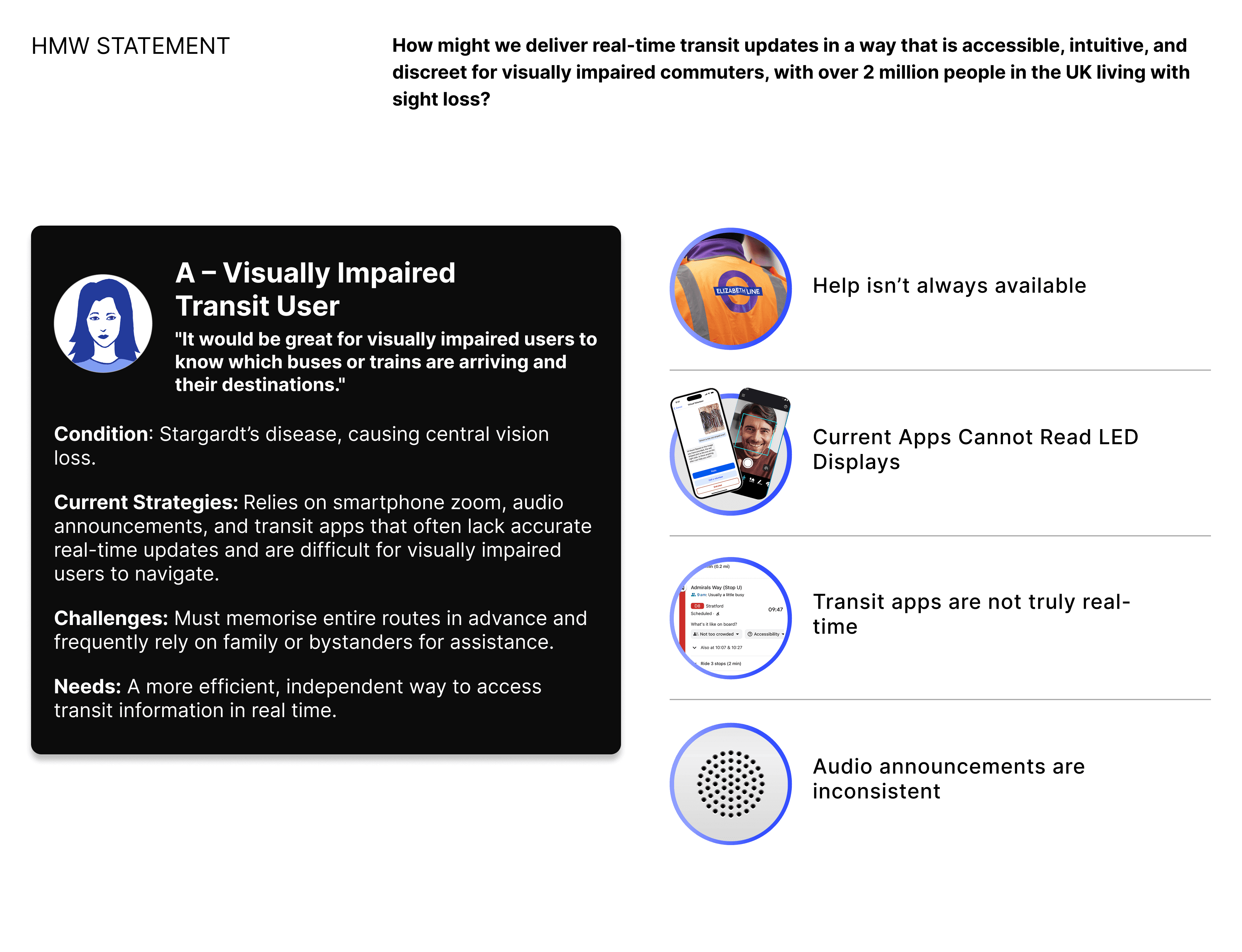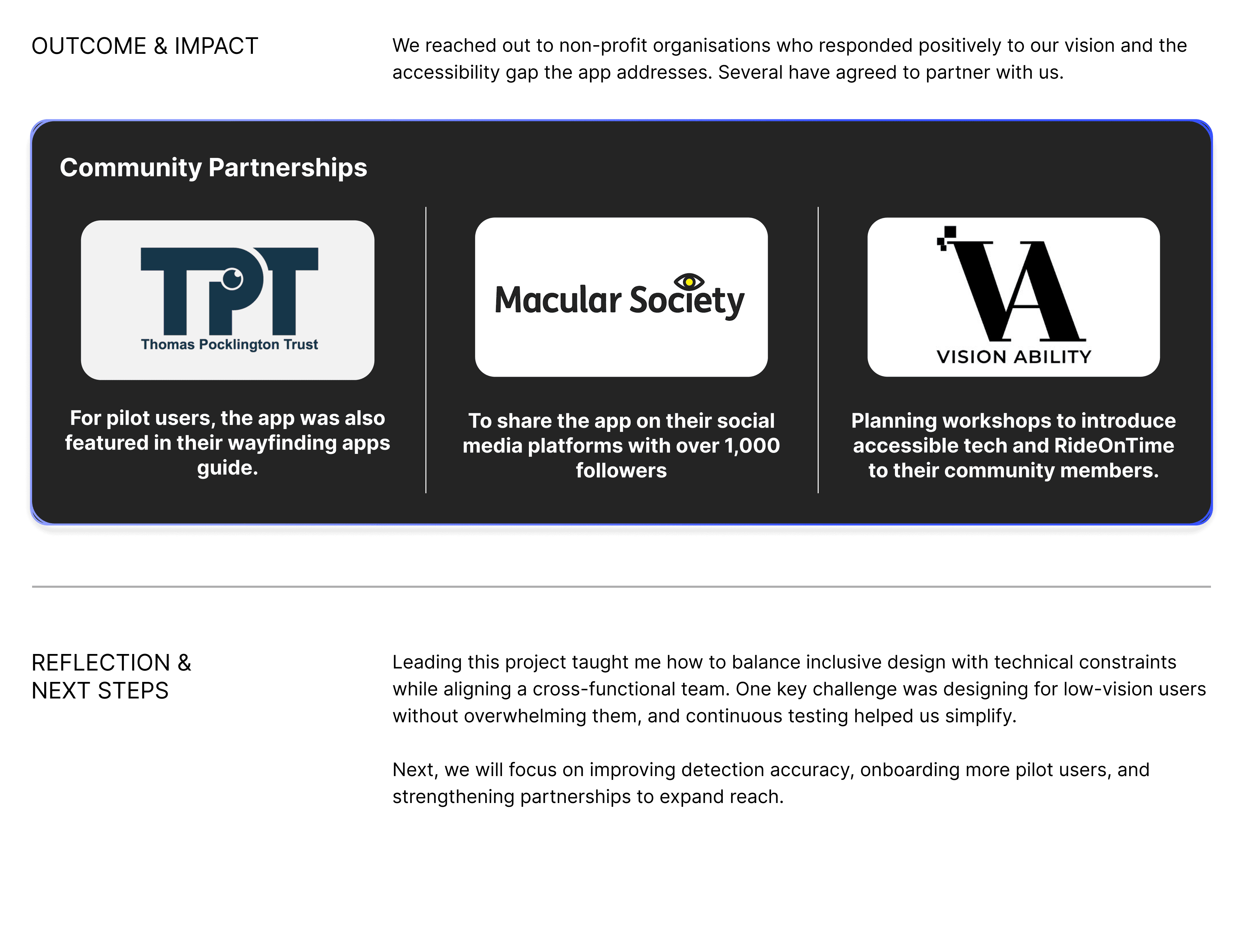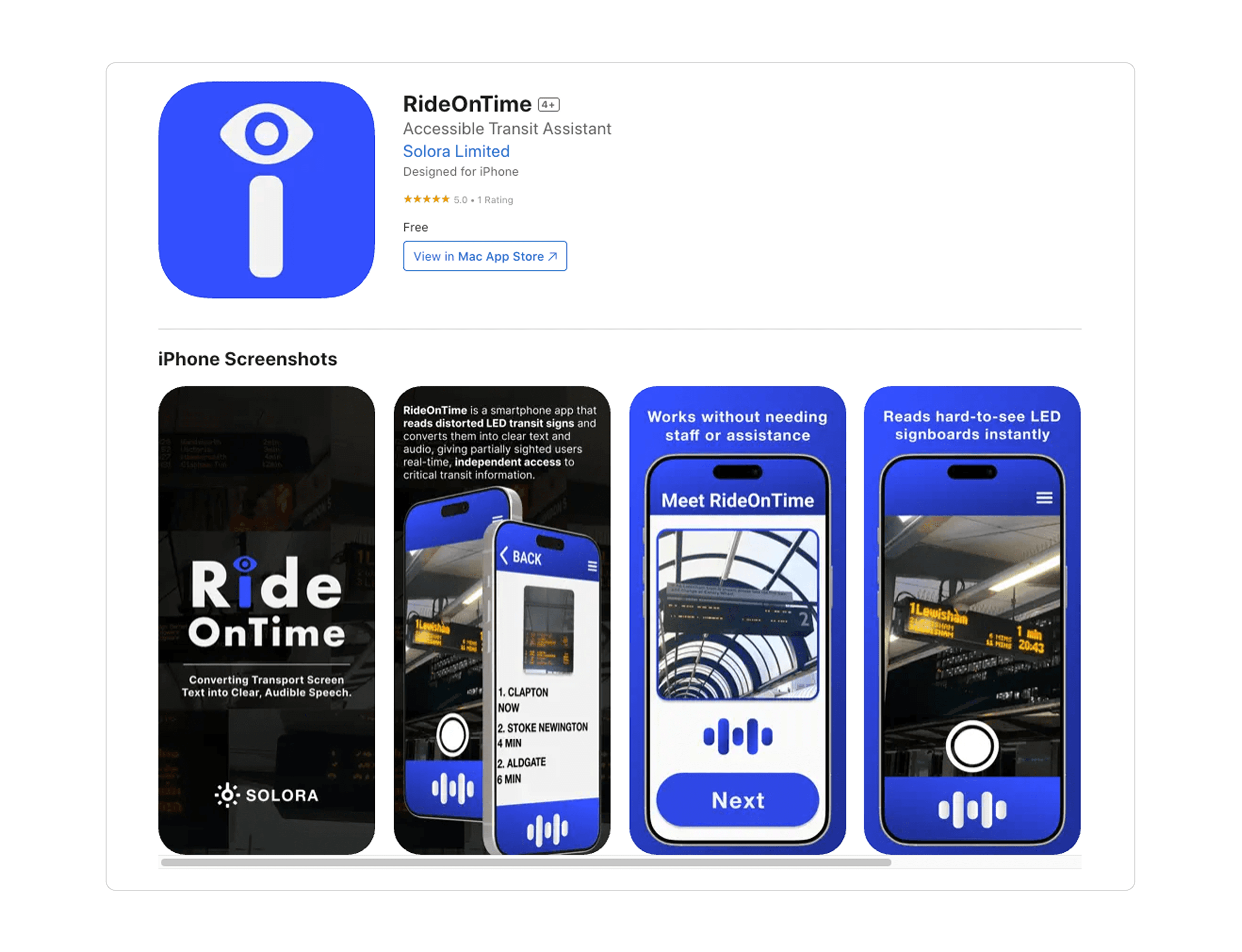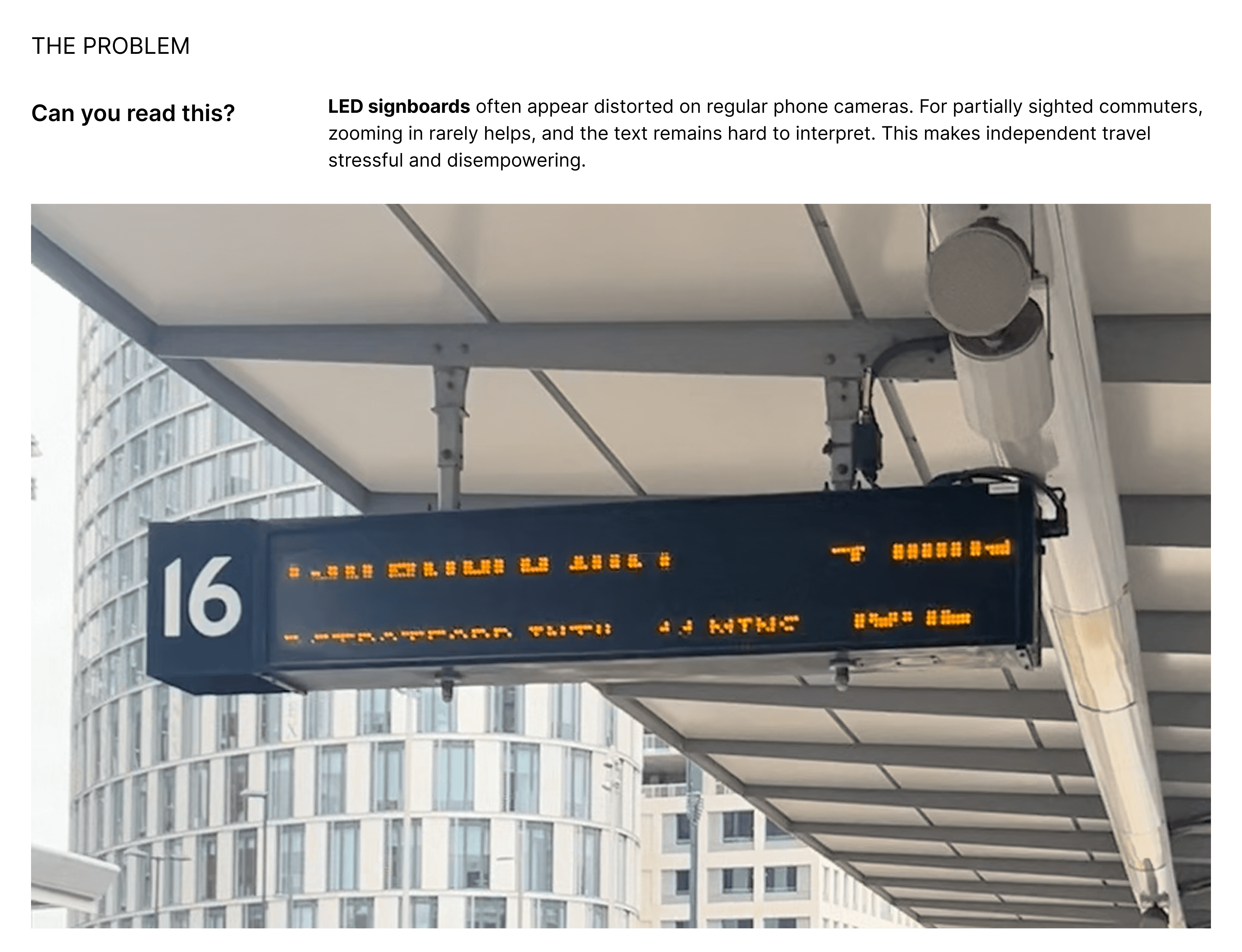RideOnTime is a mobile app that helps visually impaired commuters by turning unreadable LED transit signs into clear text and audio.